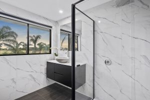 Upper-level living areas are oriented toward Lake Mulwala. Open-plan layouts, clean white finishes, and stone-topped kitchens provide a quiet sophistication, allowing sunlight, air, and vistas to become part of the experience rather than merely decoration. Bedrooms are generously proportioned, while bathrooms combine high-quality materials—marble, stone basins, waterfall showers—within a design language that is elegant and functional.