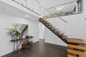 Inside, a central floating staircase of steel, hardwood, and glass forms the home’s structural and visual spine. Rising through the full height of the interior, it is paired with a tri-pendulum glass-cluster chandelier that draws light downward and accentuates the vertical volume of the space. The effect is sculptural rather than ornamental—an intentional moment of arrival that connects upper and lower living zones while maintaining clarity of circulation and natural light.