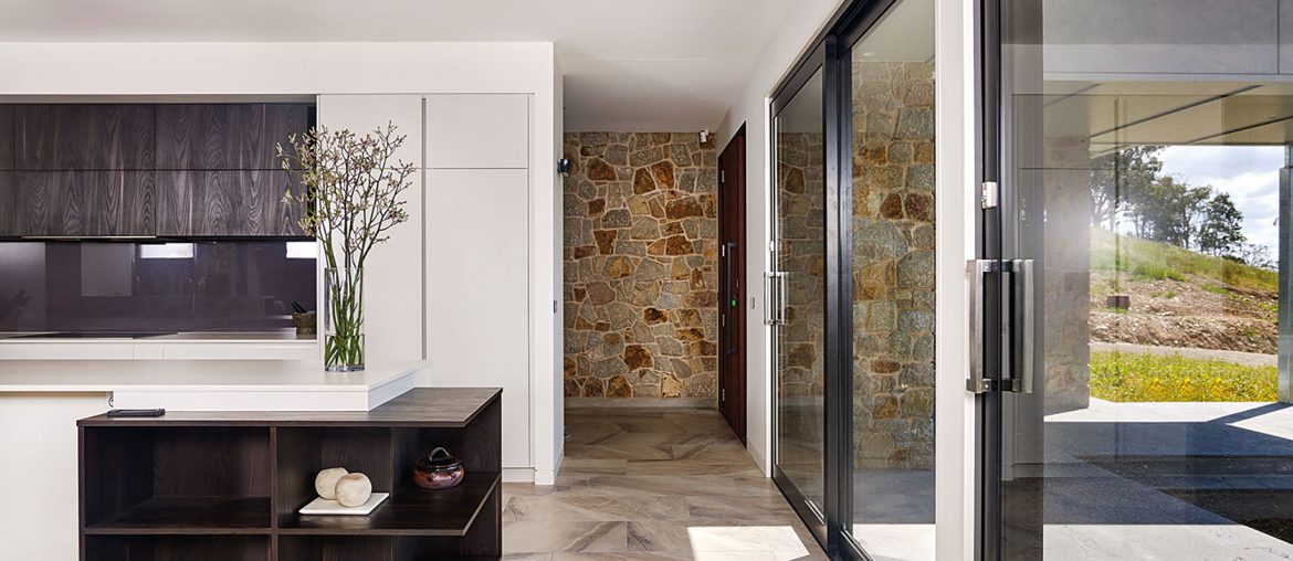 Deep-set eaves shade the interior from harsh summer sun, and high-rated ceiling and wall insulation passively controls the climate. Temperature control is furthered by extensive use of energy-star-rated argon-filled double-glazed windows that ensure minimum temperature loss through ‘thermal break’ technology that even reduces the conductivity of the aluminium frames. The sliding doors, built the same way, glide smoothly at a touch of their sleek gallery-inspired handles. The large glass panels showcase grand mountain vistas. The elements are so effectively controlled that despite the home’s lofty perch it feels more like a whisper-quiet modernist cocoon safely nestled into the hillside. There’s no sense of clifftop fragility as you look out across the slopes and valleys, snugly protected against the harshest winds and noisiest squawking cockatoos.